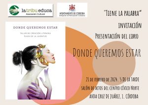 Presentación del libro “Donde queremos estar”. Día 21 de febrero en el Salón de actos del Centro Cívico Norte (Córdoba) a las 17 horas.  Libro creado en el taller de relato corto y poesía de la Asociación Plaza de la Juventud e ilustrado por el colectivo ENFOCO. El resultado es, en palabras de sus creadores, un encuentro entre imagen y palabra con un vínculo común, ofrecido a los lectores para que estos desentrañen sus significados.